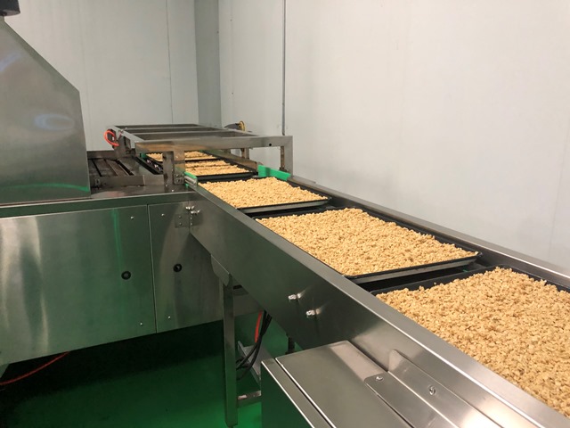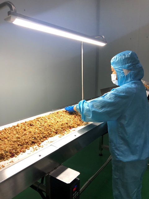 燕麦烘烤后,先与多种水果干、坚果以及谷物圈等充分混合,包装前再按比例加入超丰富多口味的冻干酸奶块,最大程度保证酸奶块的香脆口感。经自动包装机装袋后,称重、装箱。