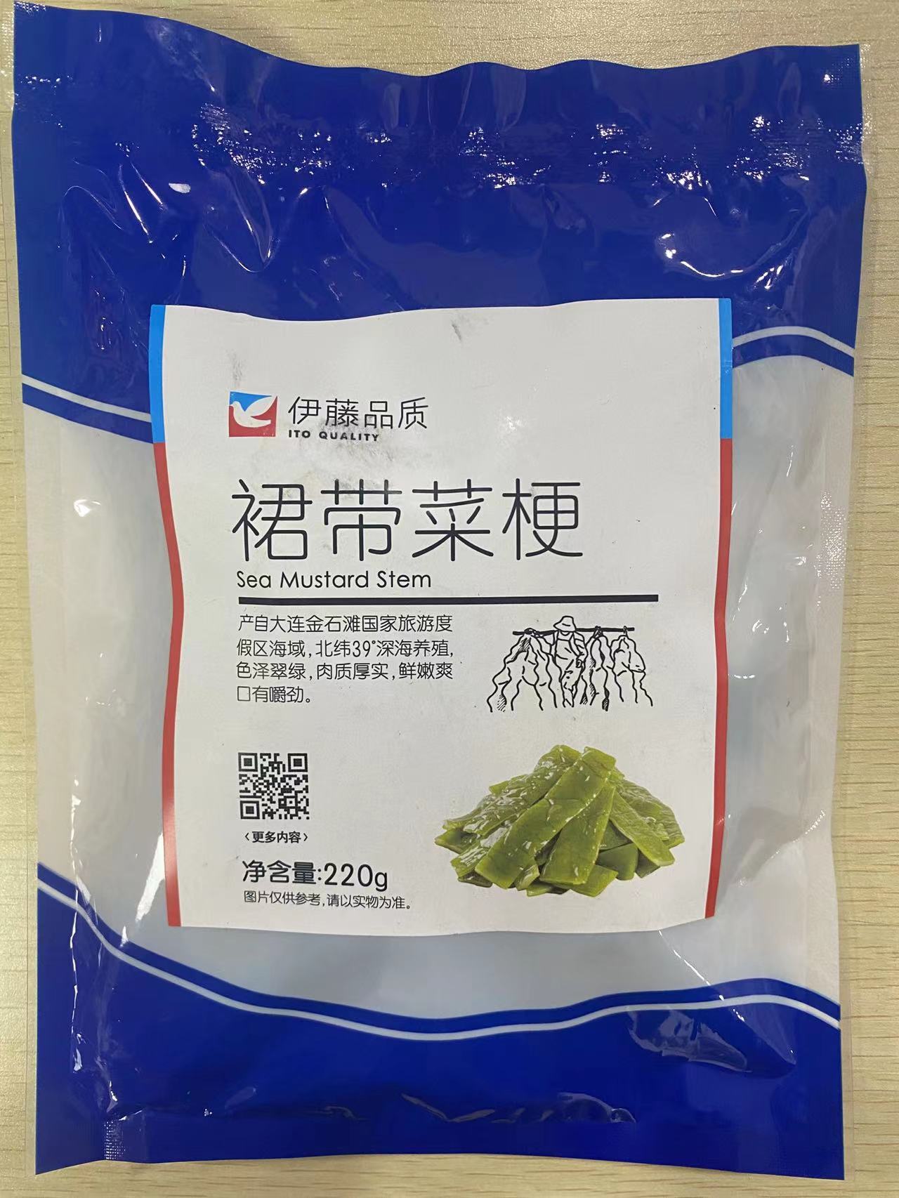 伊藤品质裙带菜梗精选裙带菜上鲜嫩饱满的部位,经人工去叶划边,划边的梗经人工按尺寸划开切断而成。