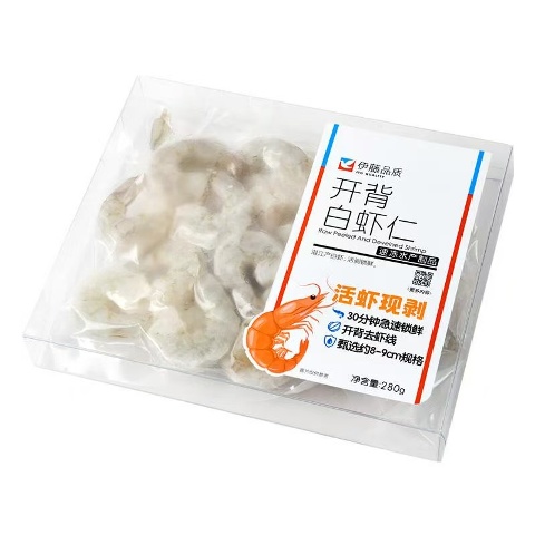 限定使用广东湛江产南美白虾,活虾加工。选用31-40只/磅的大尺寸,包冰仅保护性冰衣。采用开背工艺,人工去虾线,免处理食用方便。